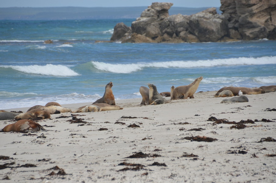 7. März 2014: Die MS Europa liegt seit 7:00 Uhr morgens in Penneshaw (Kangaroo Island) Australien auf Reede. Wir sind gegen 12:00 Uhr mit dem Tenderboot auf die Insel gefahren und wollen die Seal Bay (Seelöwenbucht) besuchen. Ein Bus hat uns abgeholt und an diese Bucht gebracht (1 1/2 Std Busfahrt). Weil diese Bucht durch ein Riff geschützt ist haben sich vor Jahren die Seelöwen hier gesammelt. Diese Bucht bietet Schutz vor Haifischen. Es ist Aufgabe der Ranger nur geschlossene Besuchsgruppen hereinzulassen und nicht näher als 10 Meter an die Tiere.
