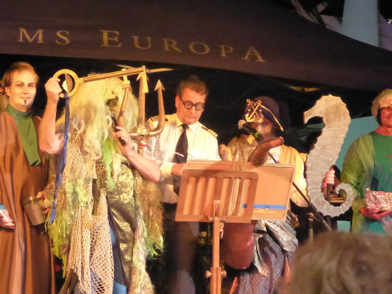 30. Januar 2014: Tagsüber hört man sich einen Vortrag von Prof Witte (Uni HH) und Prof Lahnstein an (Ex Finanzminister in der Helmut Schmidt Regierungszeit) über die Lebenszufriedenheit und über Glück. Aber am Abend steigt die Poolparty mit der Äquatortaufe. Tolle Bilder am Ende. Ingeborg hat sogar einige Male getanzt und bekommt bei der Taufe eine Urkund mit ihrem neuen Namen: Ornat-Septenkoralle, Erika heißt und Herbert nennt man jetzt Springkrebs. Die Taufe ist ein übliches Ritual, wenn ein Passagier zum ersten Mal auf See den Äquator überquert. Der Ursprung liegt wohl bei den alten portugisieschen Seefahrern, die ihre Angst beim Überqueren des gefürchteten Äquators besiegen wollten. Hauptperson des Rituals sind Neptun, Thetis und Triton.