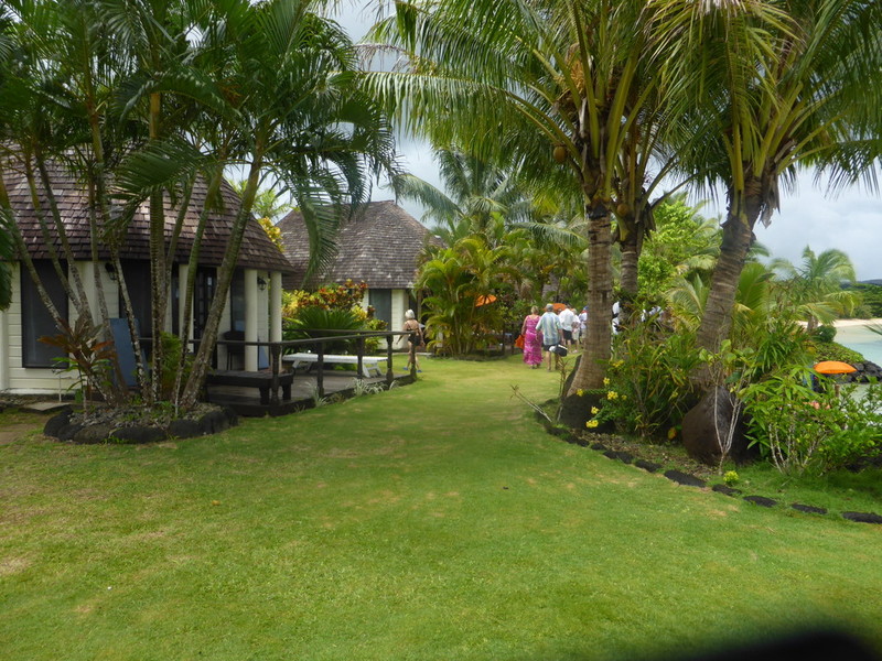 18. Februar 2014: der Opernball ist vorbei aber die ganze Dekoration erinnert noch an den gestrigen Abend. Das Schiff nimmt weiter Kurs auf die Insel Somosomo (Taveuni)/ Fidschi. Wir fahren mittags mit dem Tender an Land und nehmen an einem Ausflug teil, der uns in ein typisches fidschianisches Dorf führt. Wir werden von den Bewohnern mit Tanz und Musik begrüßt. Herbert hat das tradionelle Kava-Getränk getrunken (irgendeine Baumwurzel, die mit dem Speichel der Einheimischen vermischt wird). Junge Fidschianer haben uns die Häuser und deren Lebensform gezeigt. Danach sind wir mit den uralten Bussen zu einer Mission gefahren und hatten einen schönen Blick über die Insel. Wir haben die tatsächliche Datumsgrenze ( 180 Längengrad) besucht. Hier ist die korrekte weil geographische Datumsgrenze.